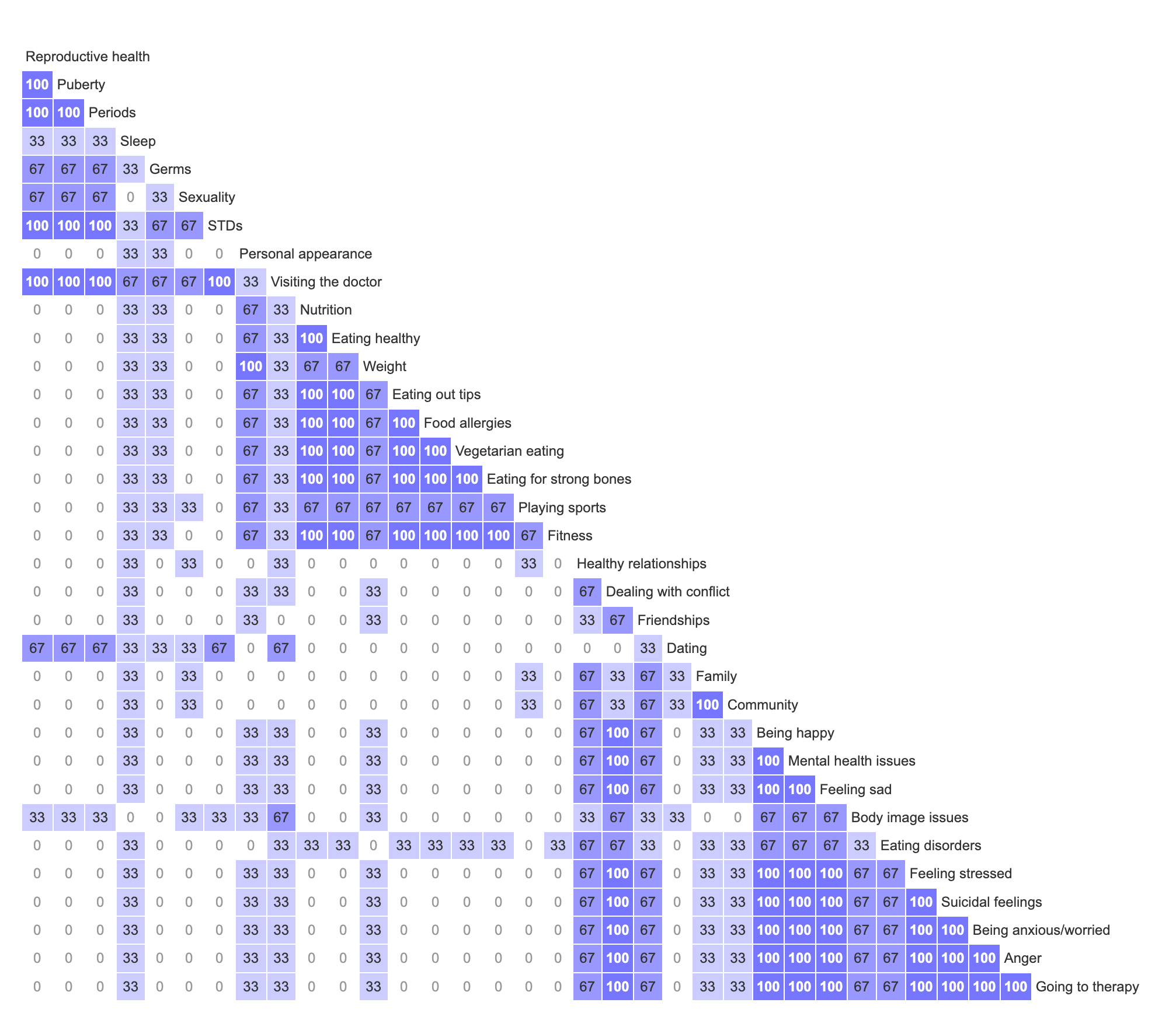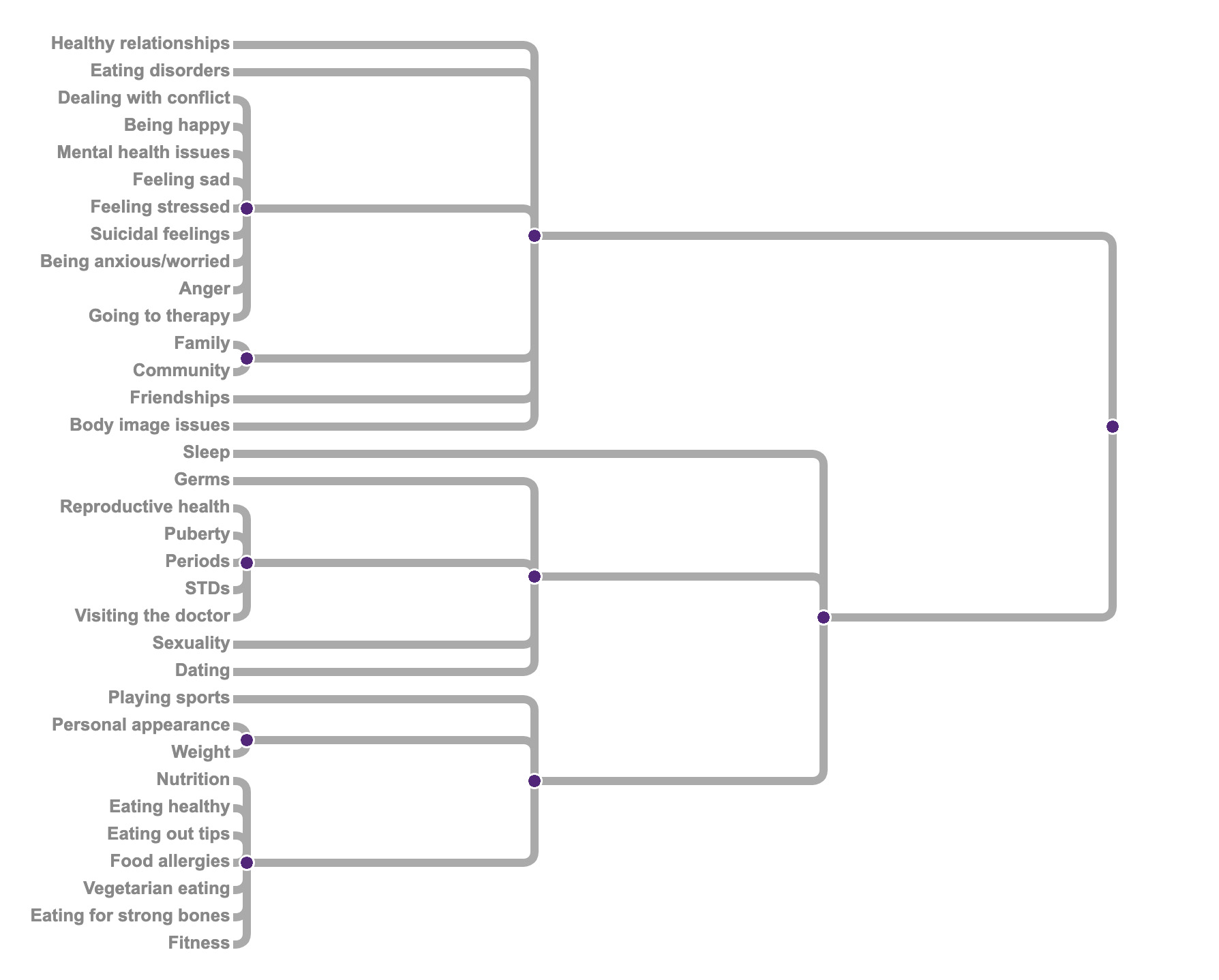 There were some instances where themes emerged. For example, the nutrition category was an exceptionally strong grouping. The only exception was that eating disorders was usually classified within the mental health category. Probably because it was seen as a disorder rather than for nutritional guidance. Another was that the cards family, community, and friendships were often grouped together, but also put in the mental health category. From one participant’s feedback: relationships of all kinds are usually seen as mental health boosters and therefore support a person’s mental state.