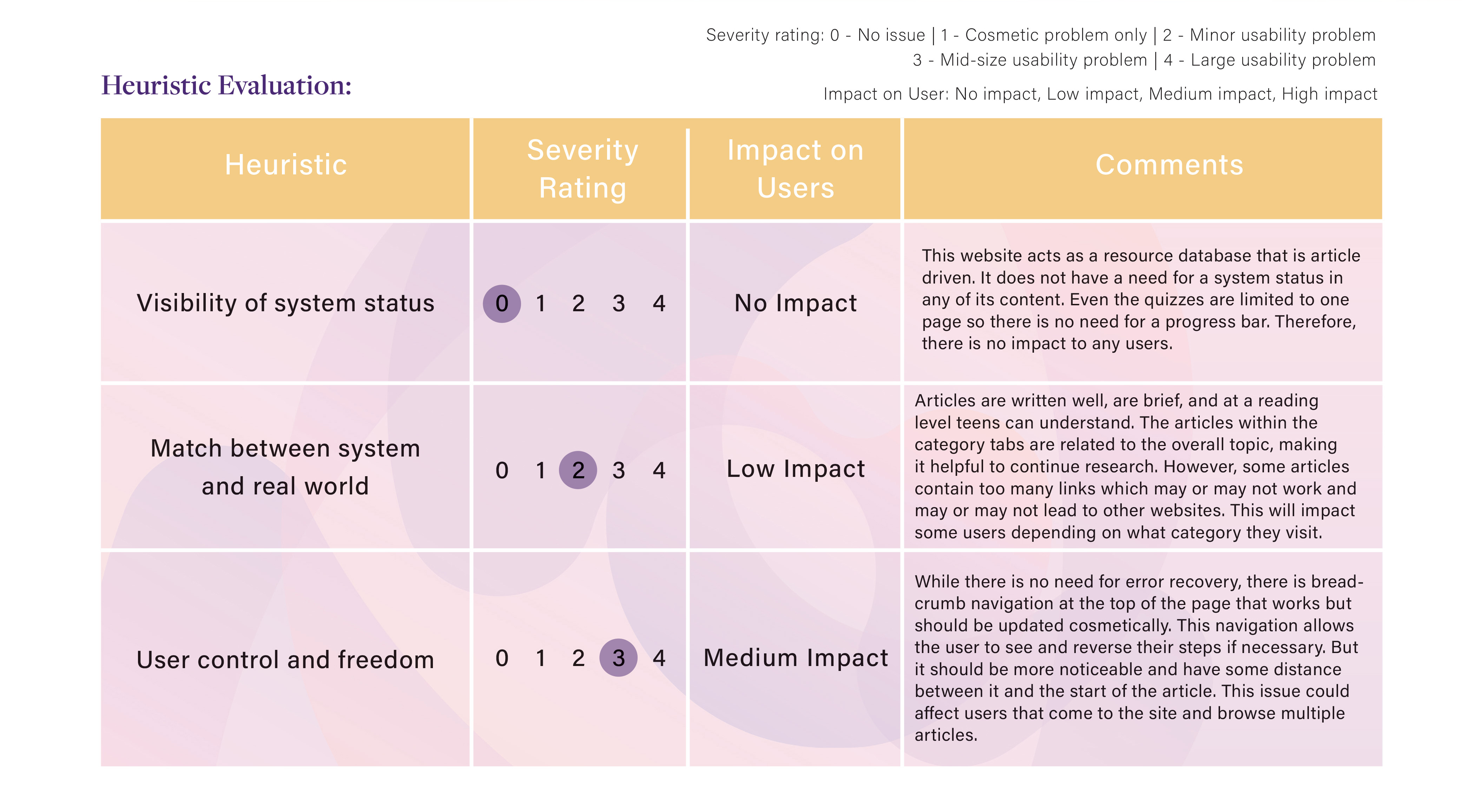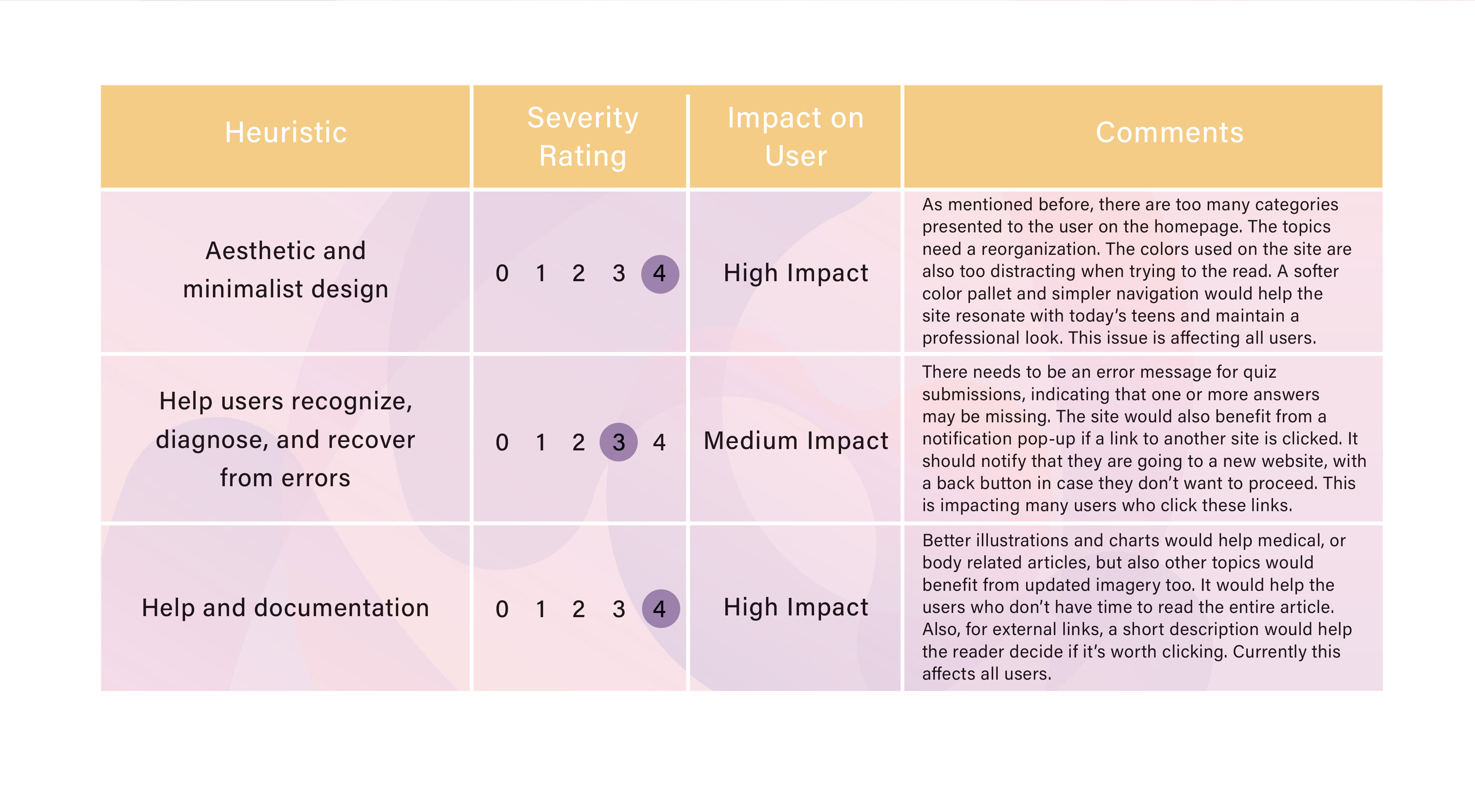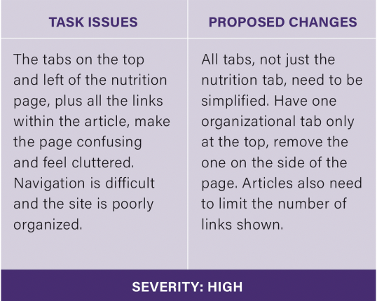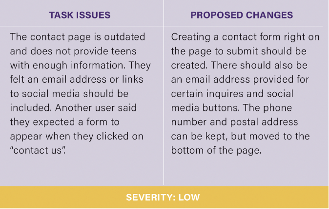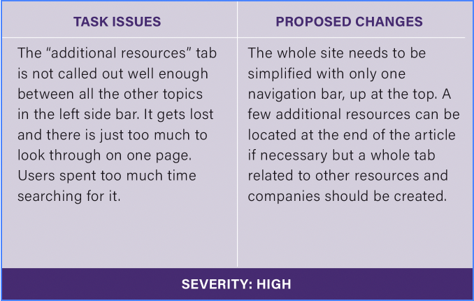 As you can see from the chart below, the heuristics with the highest severity rating (most urgent to fix) was flexibility and efficiency of use, the sites aesthetic, and its help and documentation. As mentioned before, the site’s navigation is difficult for users. So, a new way to organize all the information will be a big endeavor for designers, hence its severity rating is a 4, the highest. The site’s aesthetic is also something I want to change because the brand needs a new professional look that appeals to teens. The current colors are just too distracting and make it difficult to read articles. Lastly, the help and documentation of the site could be improved by providing better illustrations along with the articles and images that don’t feel childish.