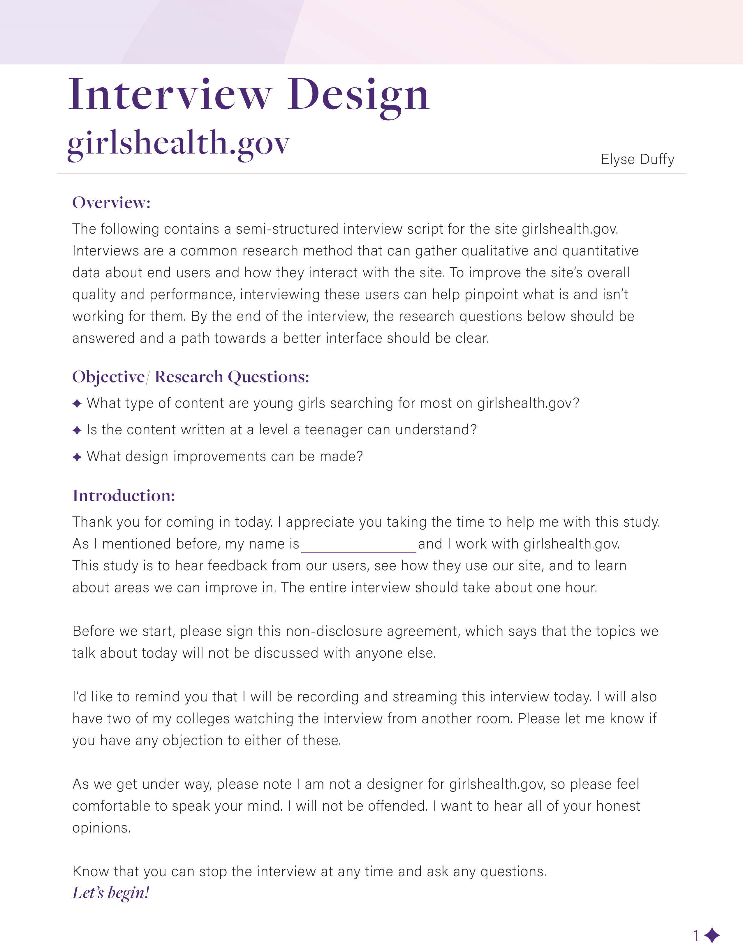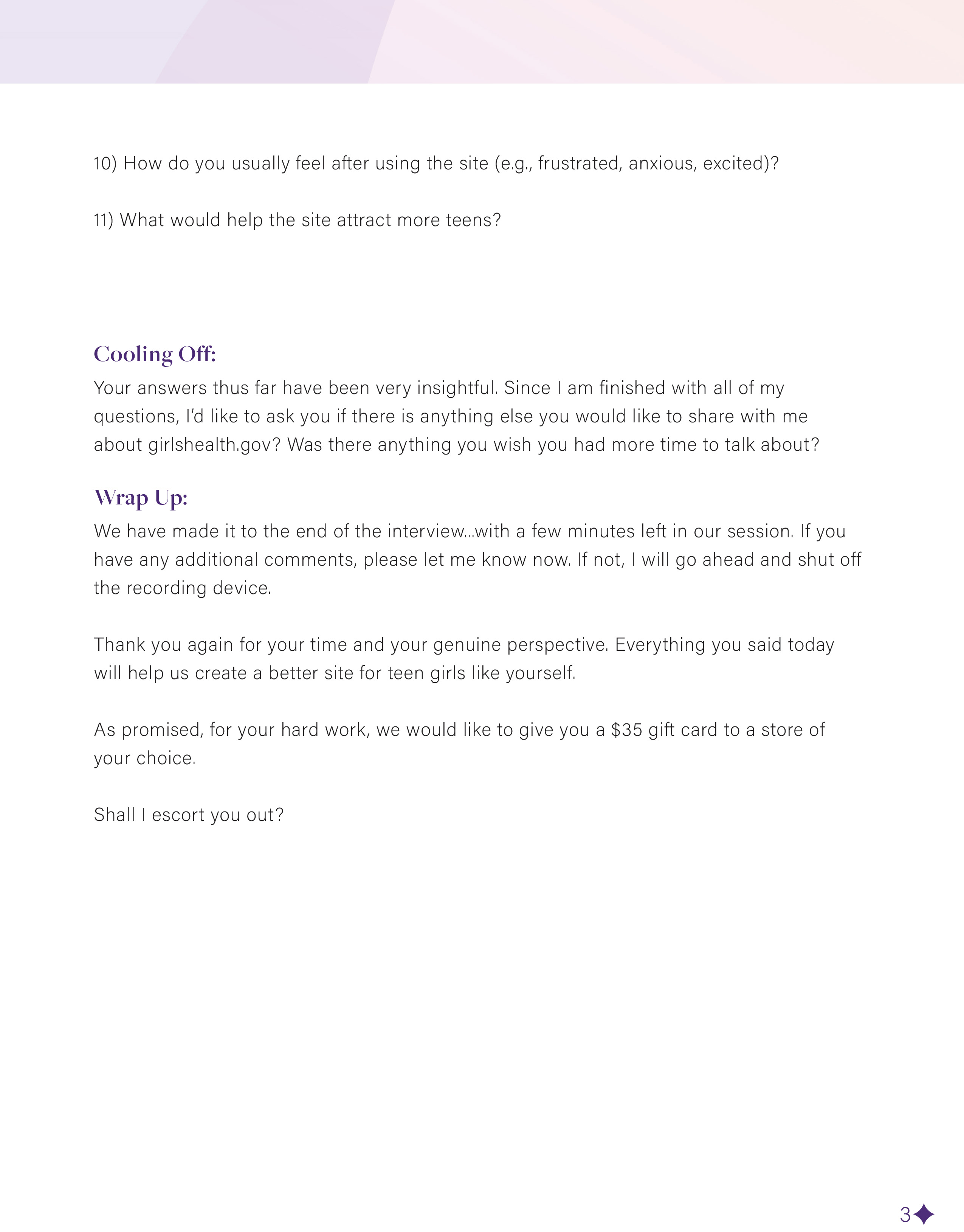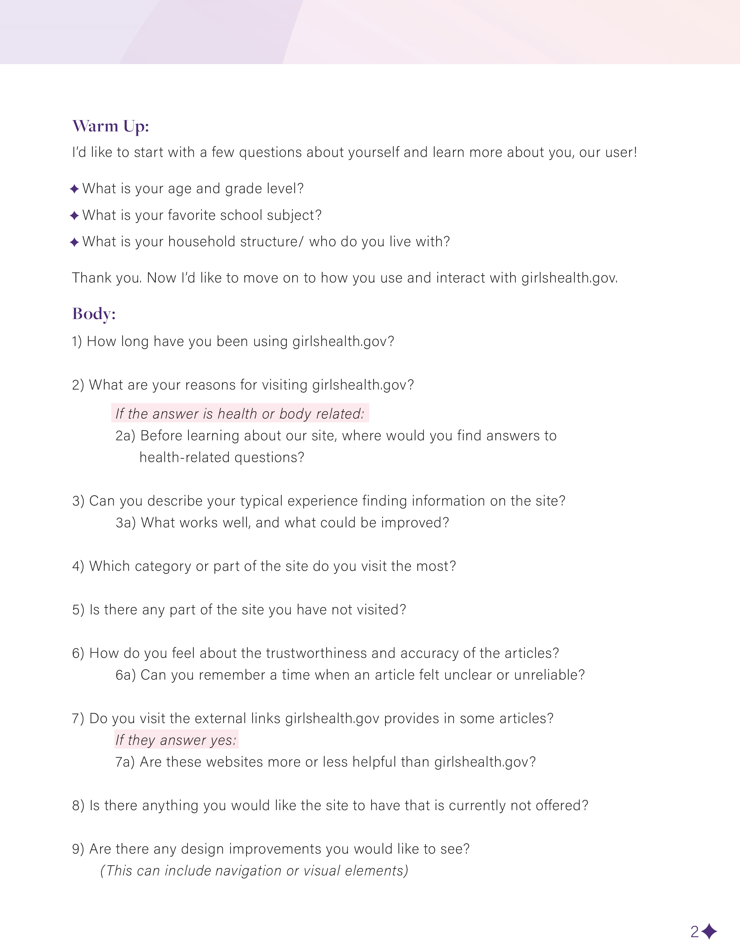 For the interview, I created 11 questions that focused on what type of content teen girls were researching the most and if the content they were reading was comprehensible. This was most important, since girlshealth.gov is a medically backed site, where they pride themselves on providing the most up to date information for a teen audience.