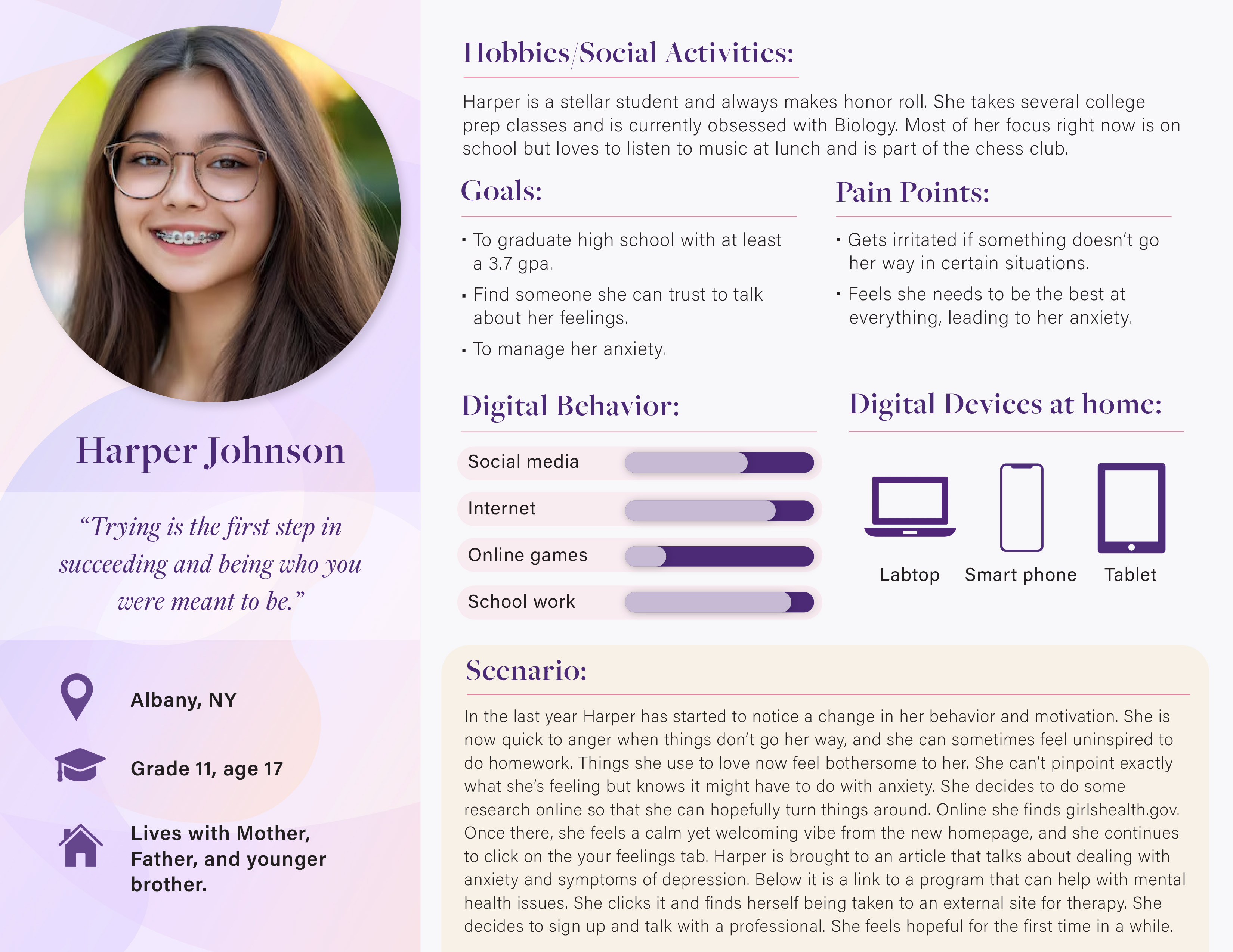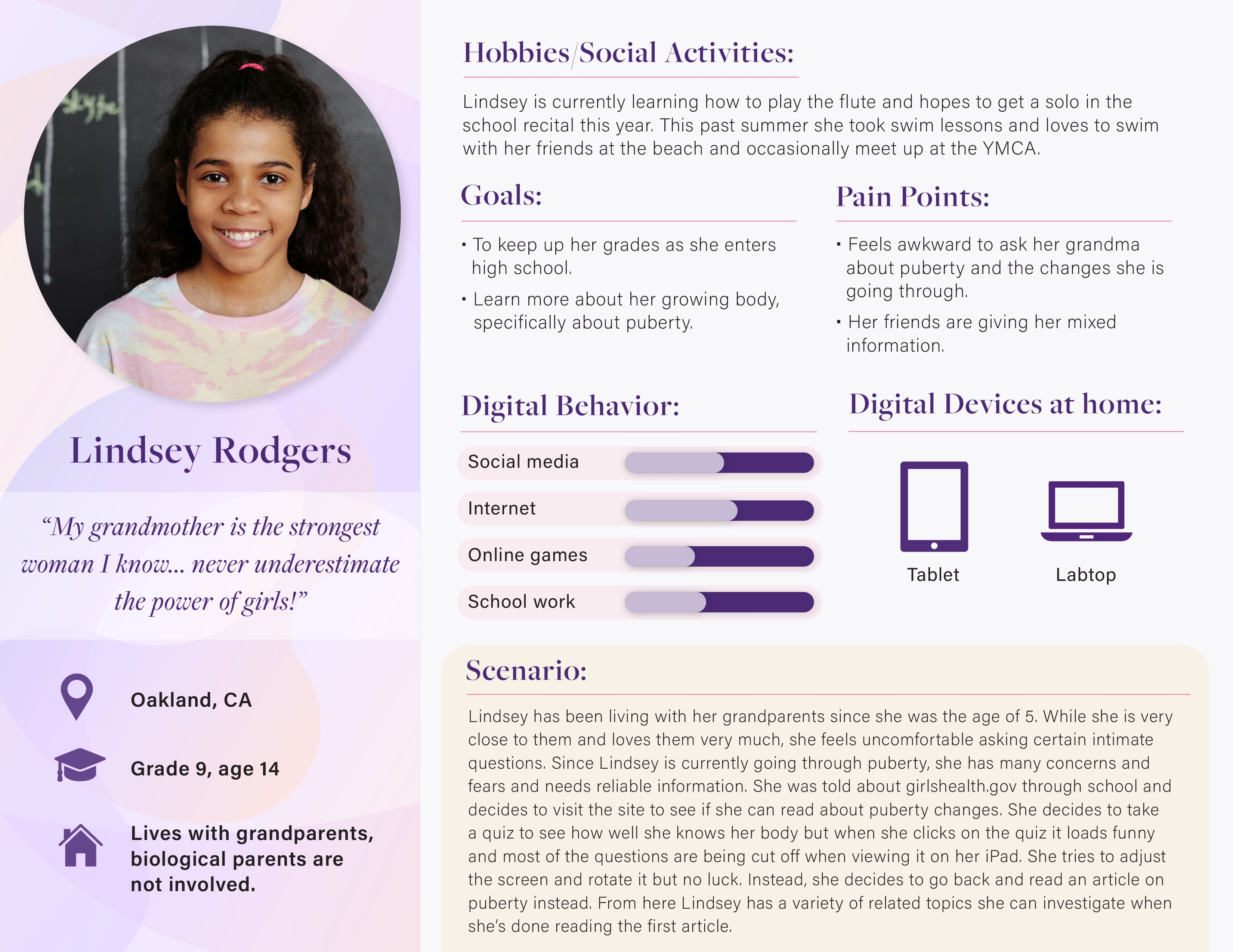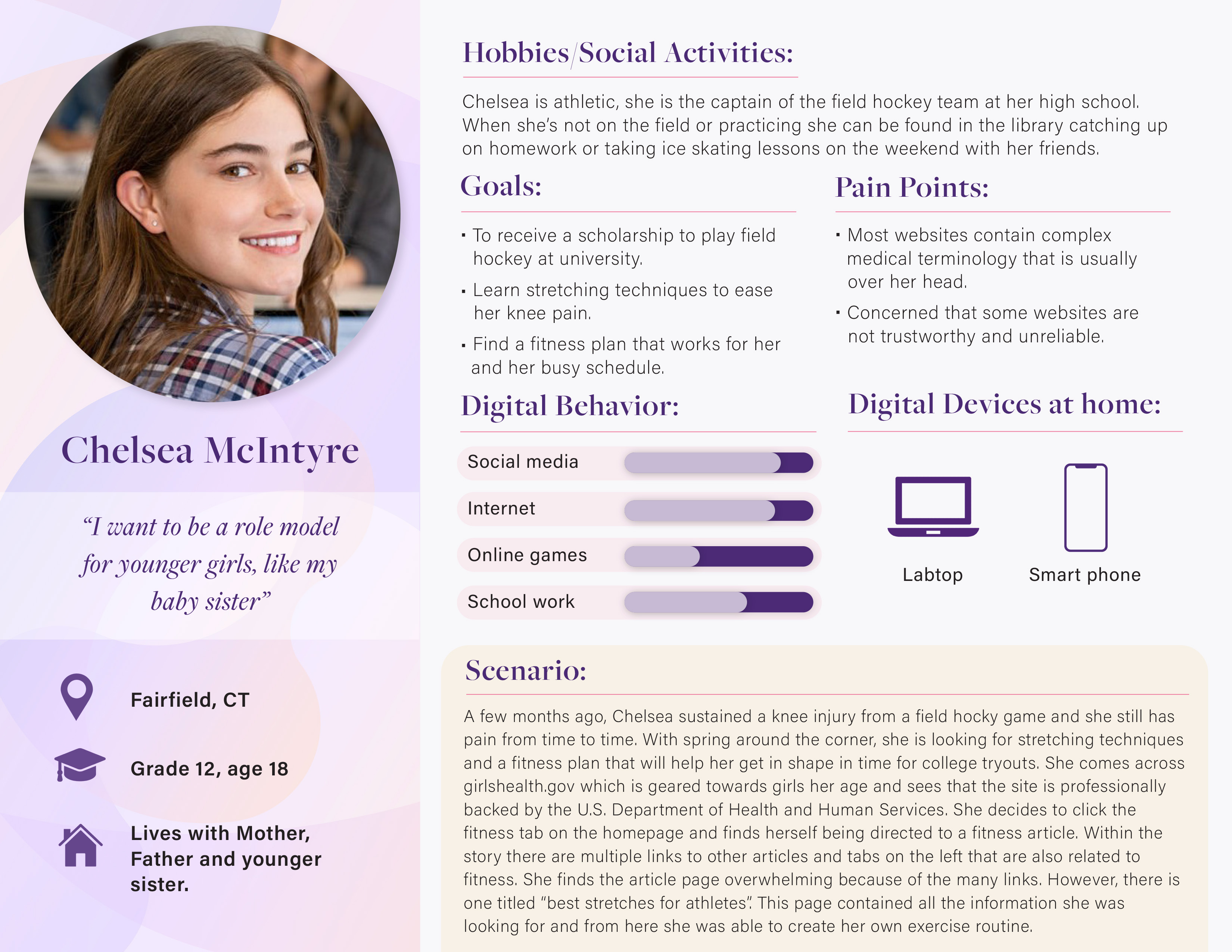 My first step in my research was to create personas and scenarios of typical users that would use the site. This helps the designers visually put into perspective who they are designing for. It also gives me a clear look into what the users need from the website. Below are three users I created. As you can see, each persona includes vital information like the digital devices they own, their goals, and the pain points they have (that girlshealth.gov should take into consideration). Once I created these, I often went back to them to remind myself of what design changes would be accepted and needed by a teen audience.