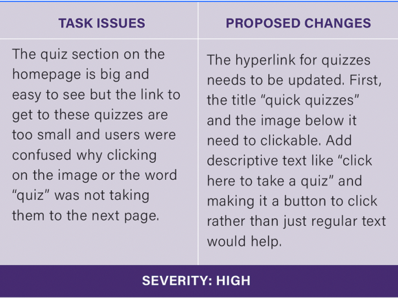 Two users were also very distressed when asked to get to a quiz from the homepage. Here it was discovered that the link to get there is actually a small line of text underneath a large image and header that says “quick quizzes”. The participants kept clicking on the image and title, yet were never taken to the quiz. This is a major error I discovered during the usability test that became a top revision for the redesign.