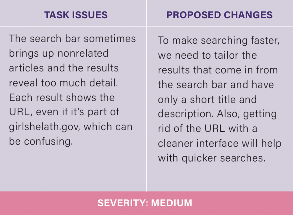 This research process has been an eye opener for me. I discovered that user testing is an invaluable part of the design process. For an organization like girlshealth.gov, the only way to improve their site is to implement these changes so that users can successfully navigate and browse the site as they wish. The issues I uncovered were much deeper than I originally thought, allowing me to see how design testing can not be rushed though or skipped over.