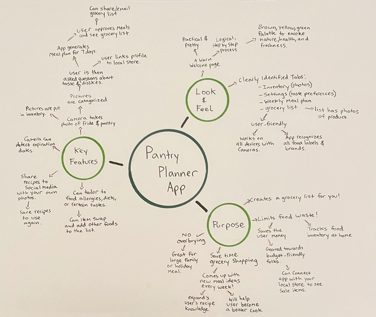 I also clearly defined the app’s purpose. Since I had already thought about this earlier, I knew it would save time grocery shopping. But the more I continued with the mind map I realized that it was doing a lot more than that… this app would prevent people from overbuying, allow the person to expand their recipe knowledge, assist them in becoming a better cook, and limit their food waste. There are plenty of upsides to this app.