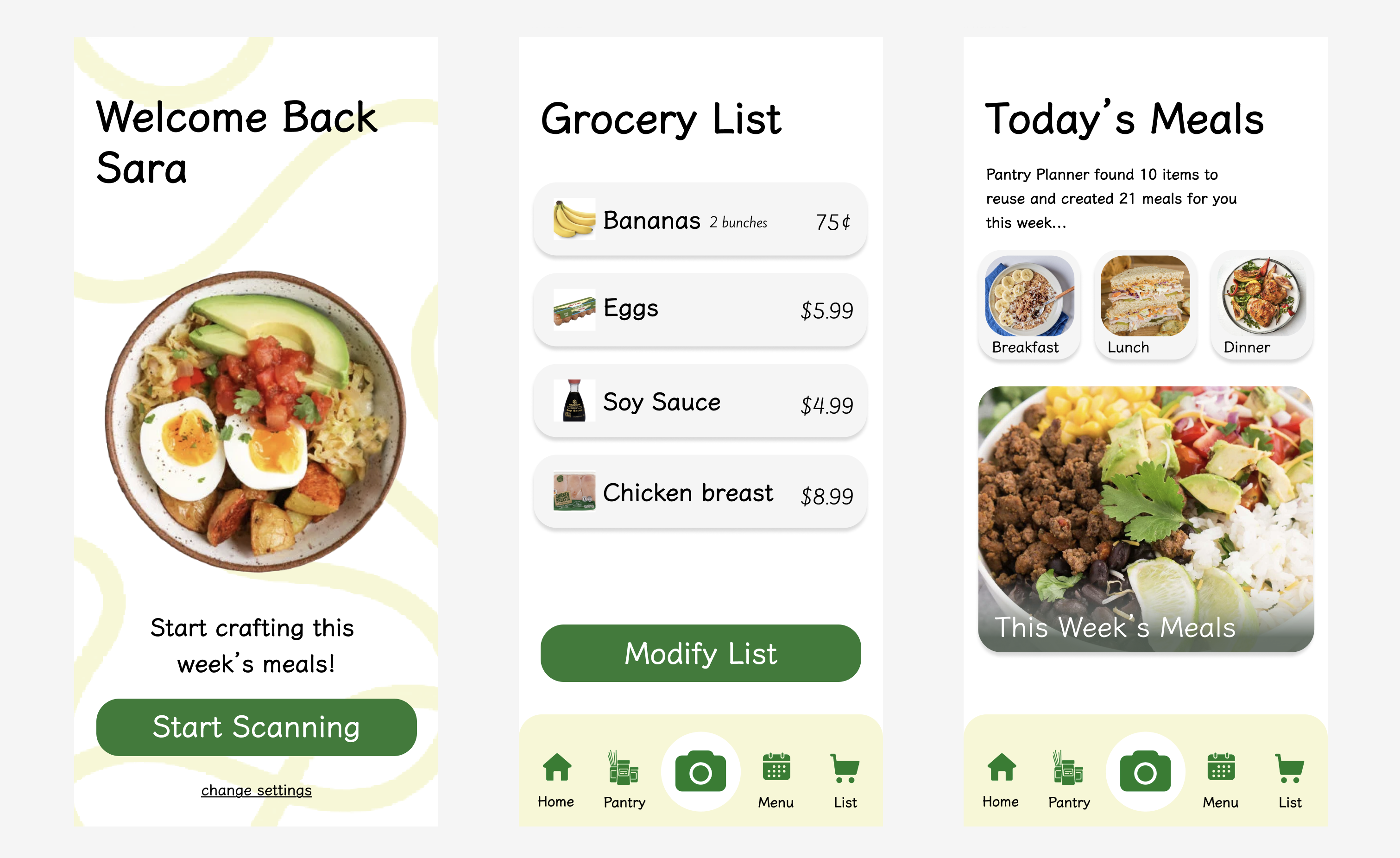 My final method was prototyping. In this step I turned my simple sketches into more solid renderings. I wanted to add color, pick fonts, and select images to develop the app’s personality. In creating these prototypes, I did some rearranging of elements and decided on how large certain features should be. For example, on the meal planning page, I felt it was important for the user to know how many ingredients were being reused and how many meals were being created. So, I felt this information should be at the top of the page rather than then bottom. Another decision I made, was getting the bottom navigation tab to be simple and intuitive. Since most users will need to be snapping photos to use the rest of the app’s features, this button should be larger than other features. Prototyping revealed to me the important parts that should stand out.