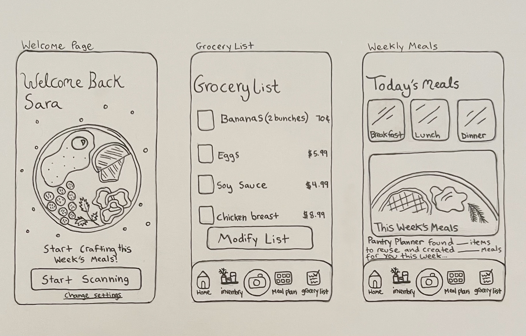 After I moved on to sketching…this is also known as sketchstorming. Here, I took my mind map and turned my ideas into visuals. I planned on sketching out three screens a user might see if they purchased the app. One was the home page, and the others were the grocery list and the meal plan page. What I discovered in the sketching process was that getting all my ideas for each page to fit was a challenge. I knew for the meal plan page it would be best to break up today’s meals and then have a separate section for the entire weeks’ worth of meals. As you can see by my sketch, today’s meals are at the top, allowing quick access to the recipes by clicking on breakfast, lunch, or dinner. Sketching gave me a preview of how key pieces would be spaced out and how user interaction would go.
