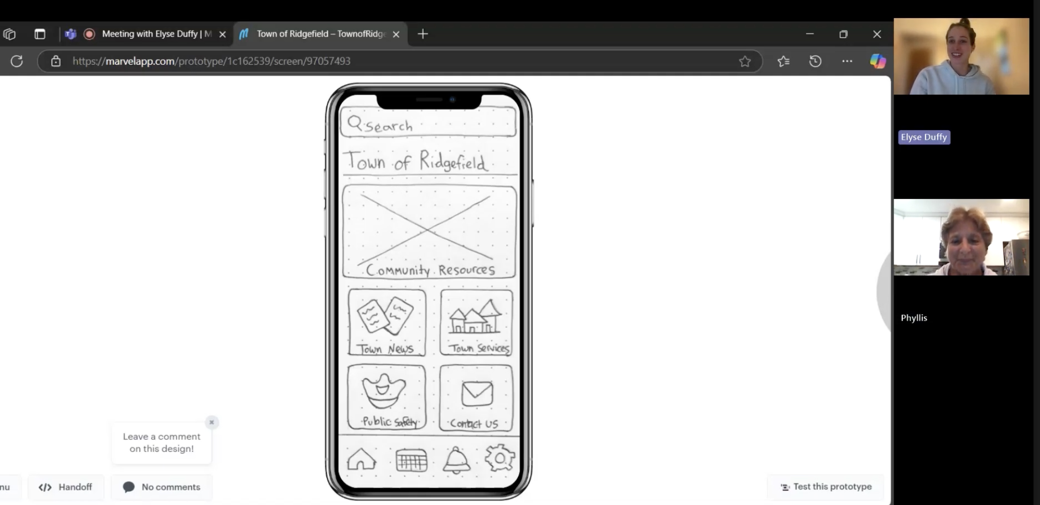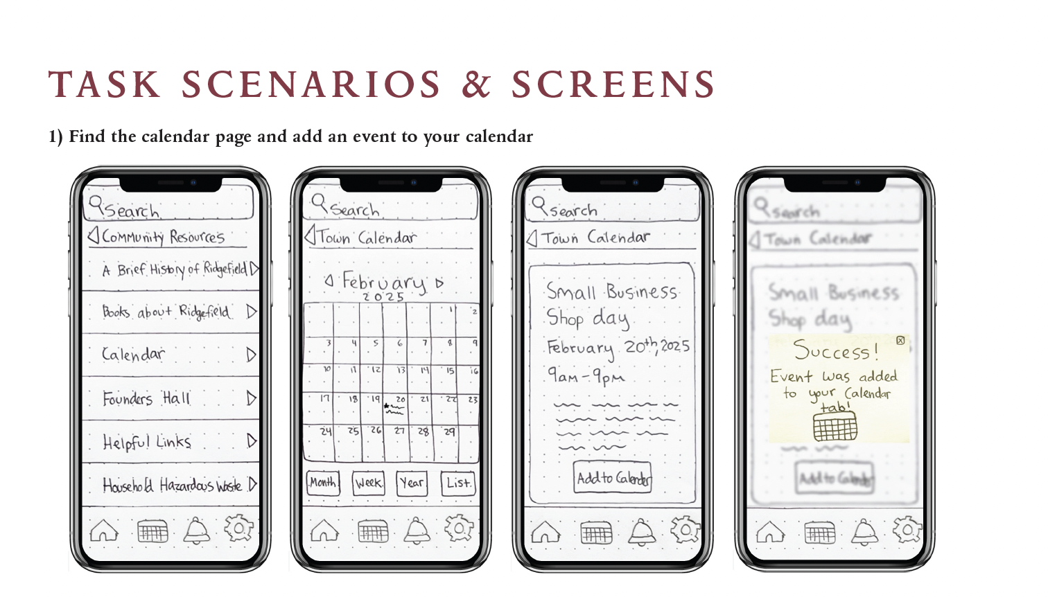 As I discussed in last week’s blog, I drew over 30 paper prototype screens to bring my app, Town of Ridgefield, to life. This process allowed me to put together my ideas and concepts into something more tangible, and this week I chose to do two user tests with these paper prototypes.