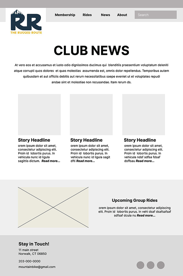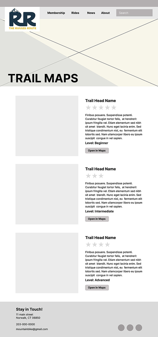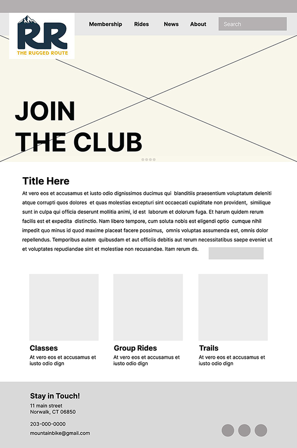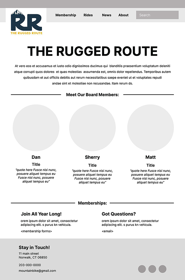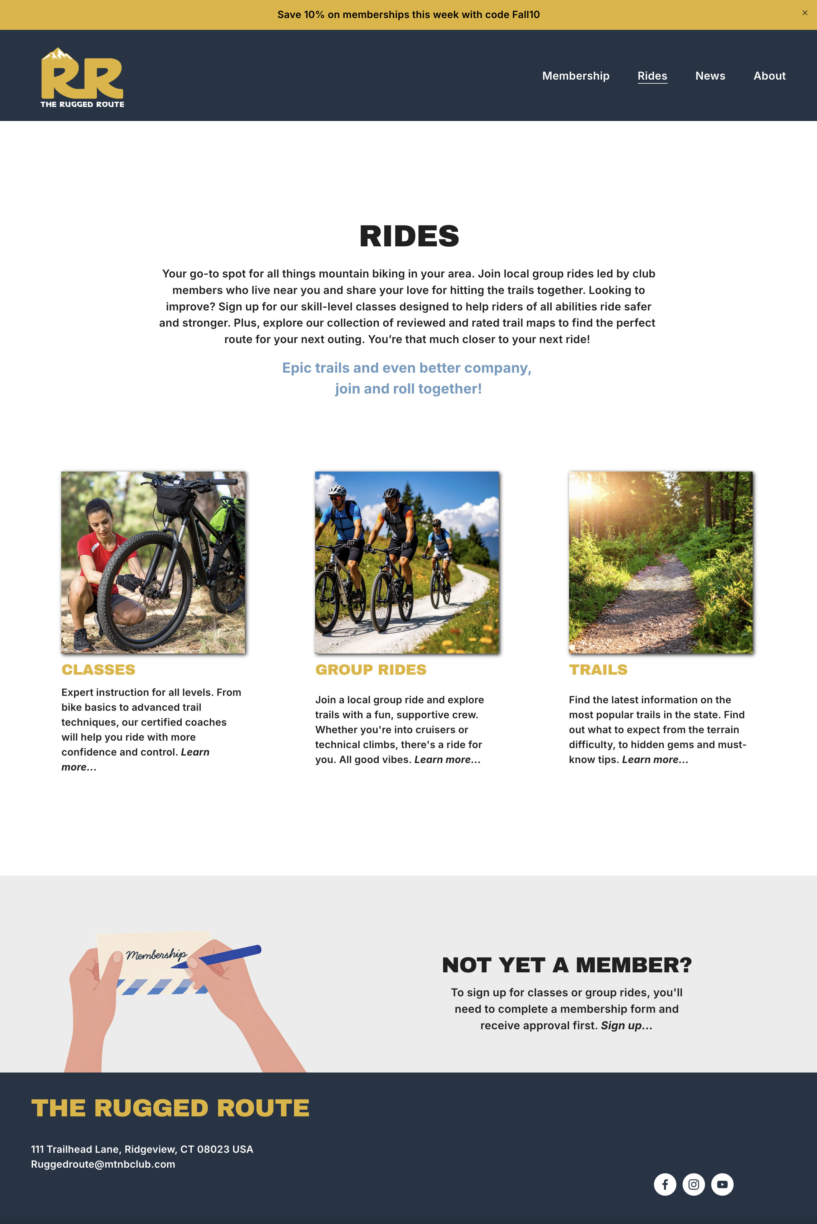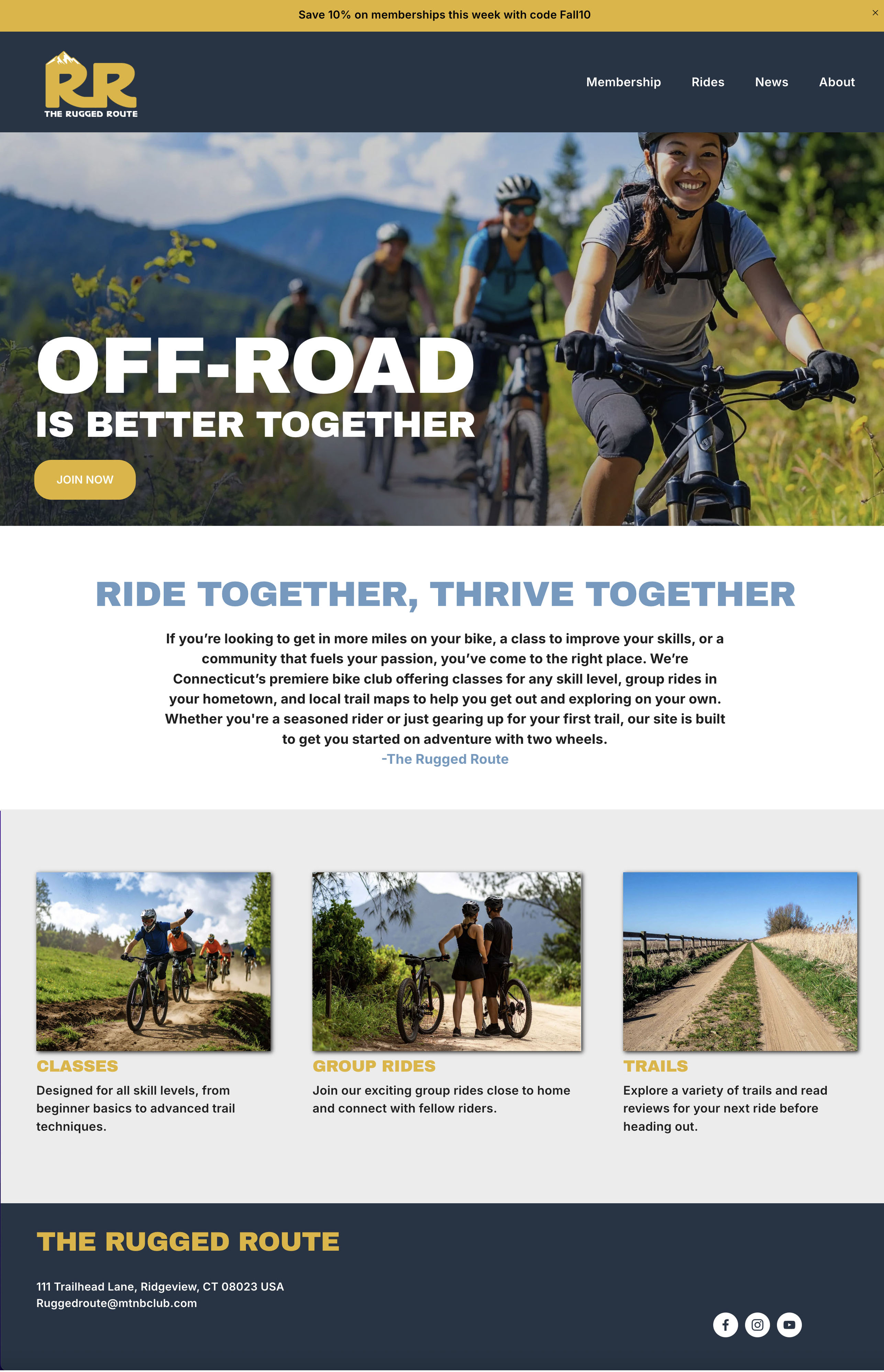 The website I had planned for this endeavor was to create a mountain bike club for Connecticut residents called The Rugged Route. As a members-only club, it will offer classes, as well as local trail maps, group meet ups, and news on the sport. While the entire site will be available to all who visit, it will be geared towards members or people thinking about joining. My goal here is to create a club community that has an online platform to supplement their real-life meetups. The website will not only support the sport, but it will be the digital home base for enhancing the club’s visibility, engagement, and overall success.