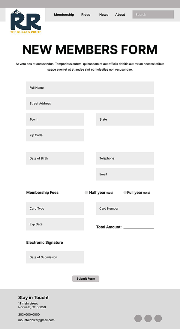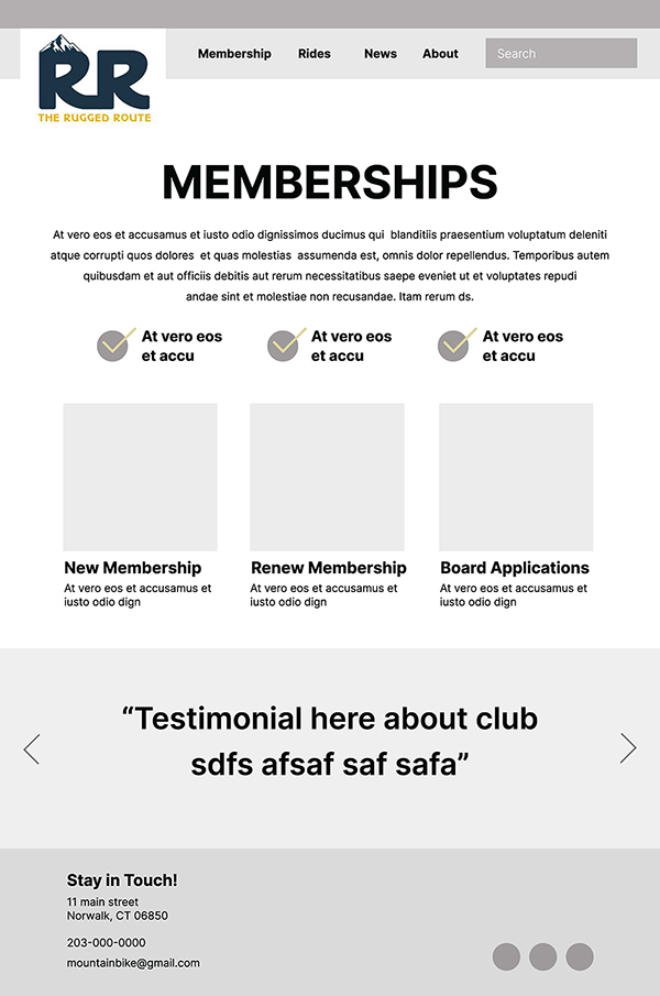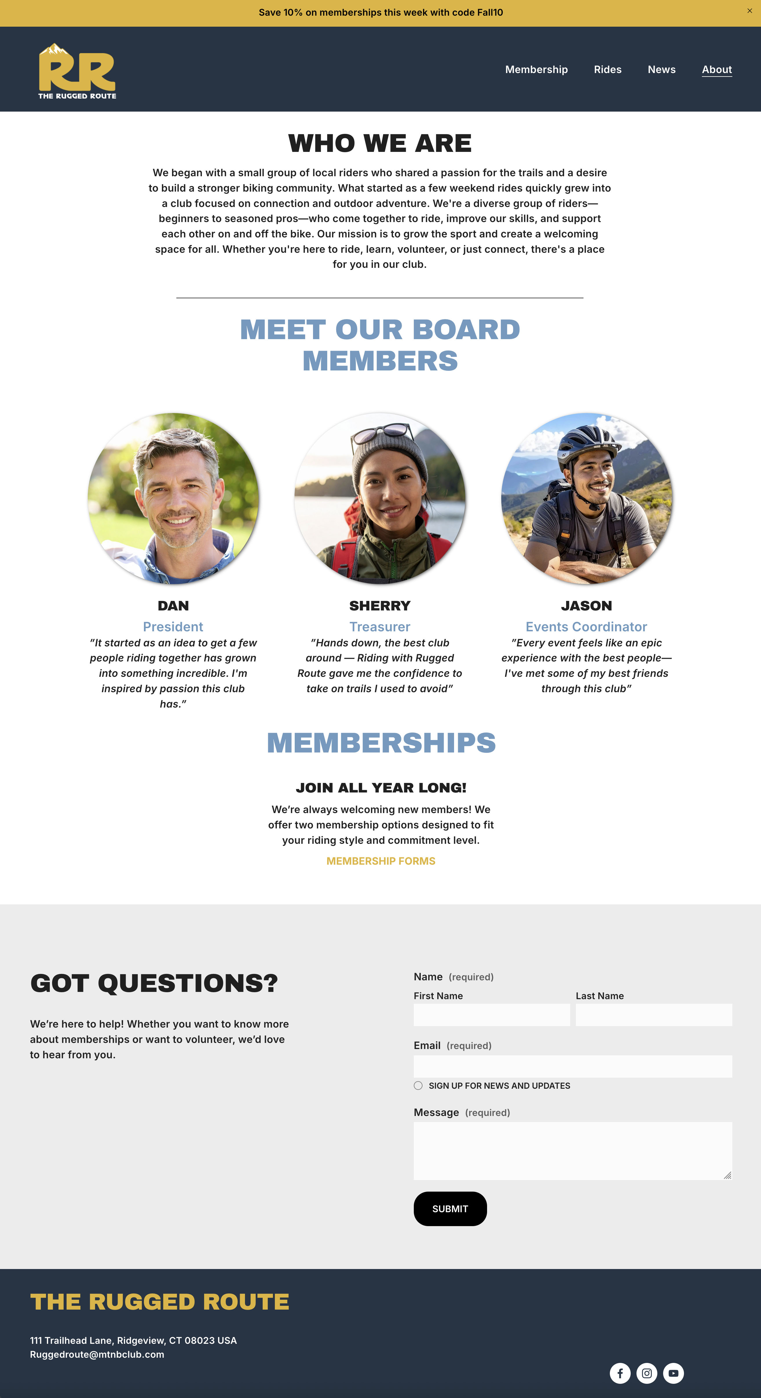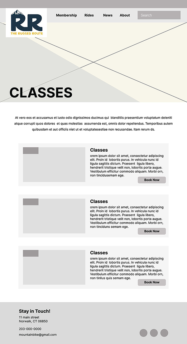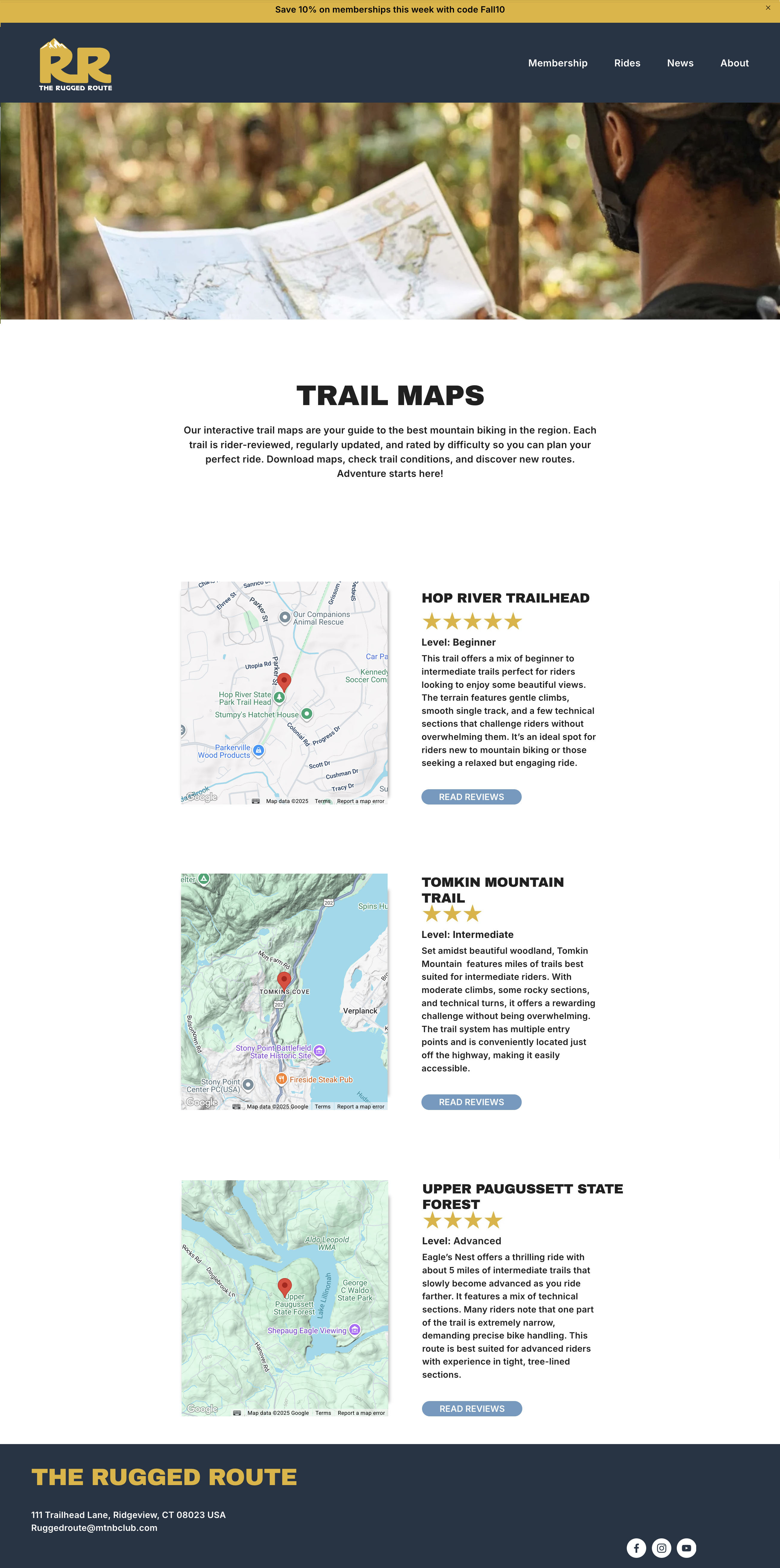 The website I had planned for this endeavor was to create a mountain bike club for Connecticut residents called The Rugged Route. As a members-only club, it will offer classes, as well as local trail maps, group meet ups, and news on the sport. While the entire site will be available to all who visit, it will be geared towards members or people thinking about joining. My goal here is to create a club community that has an online platform to supplement their real-life meetups. The website will not only support the sport, but it will be the digital home base for enhancing the club’s visibility, engagement, and overall success.