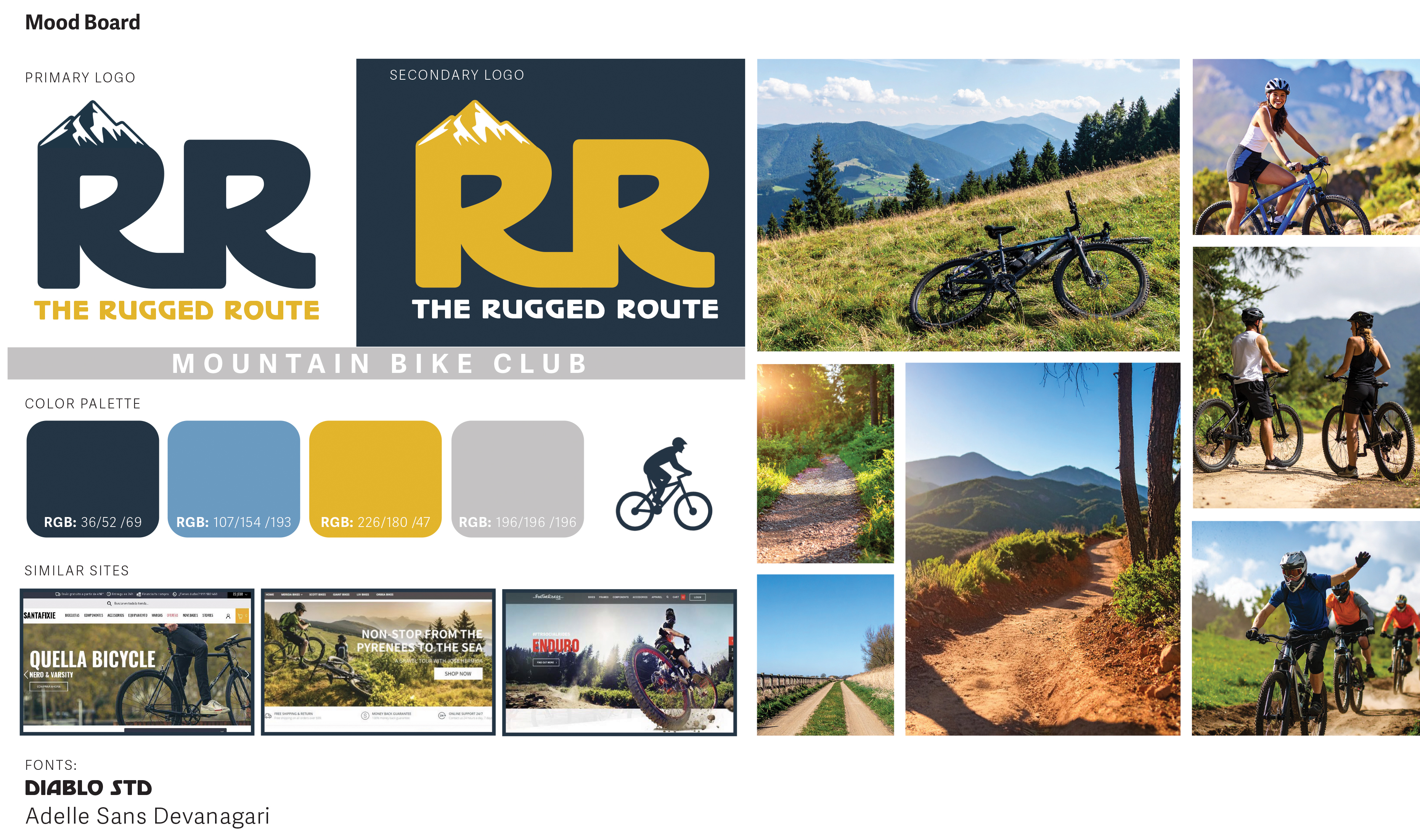 With my idea well thought out, I decided to first make a mood board. This meant that I started to collect content. I gather images I wanted to use on the site, picked a color pallet, and even made a logo for the club. After looking at similar mountain bike sites, I was able to decide on the look and feel I wanted The Rugged Route to have. For me, it made sense that the colors and images would be bold and bright. The site would have a lot of shots showing the outdoors so having these bold colors would fit in with the esthetic of the sport.