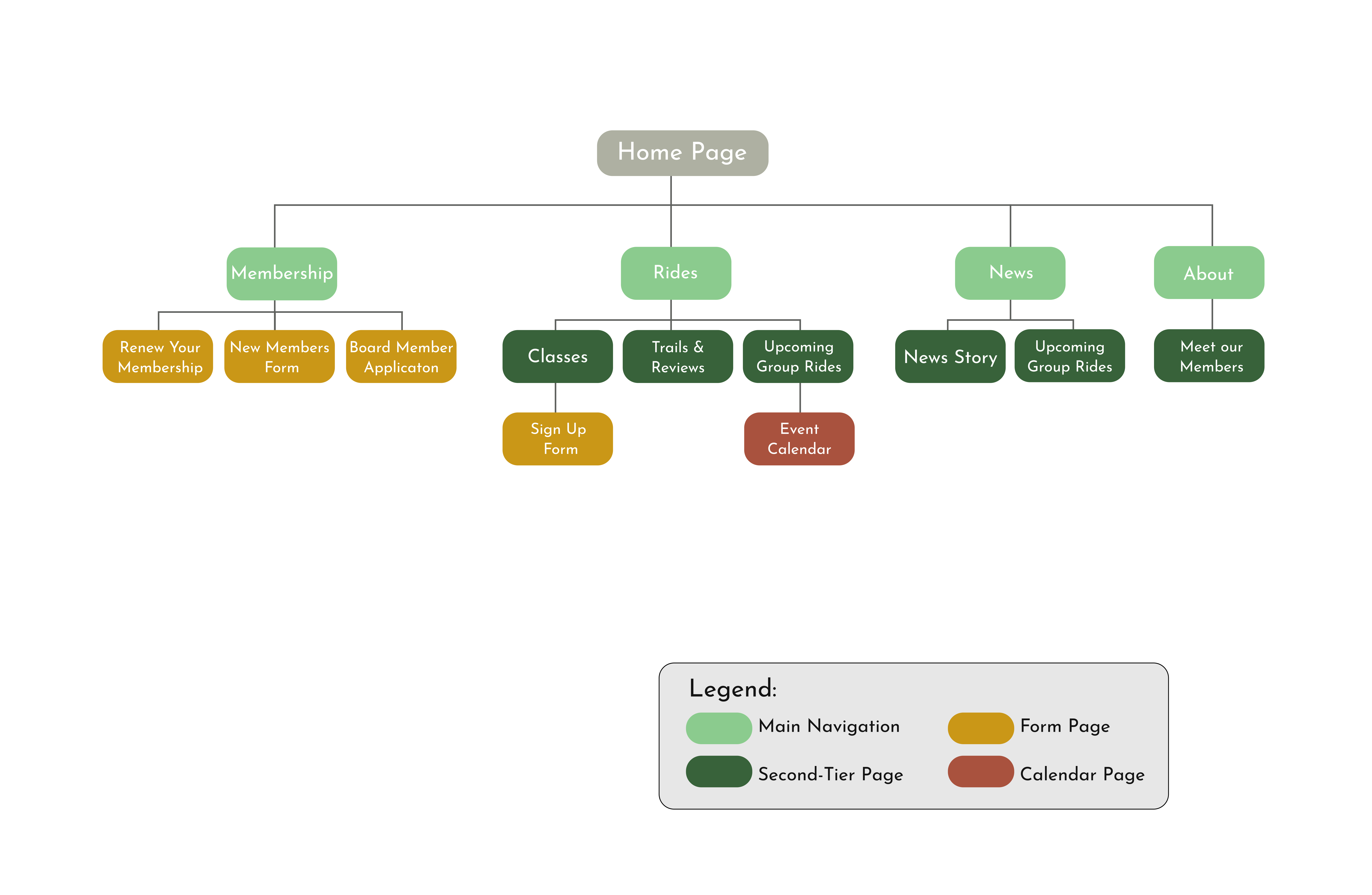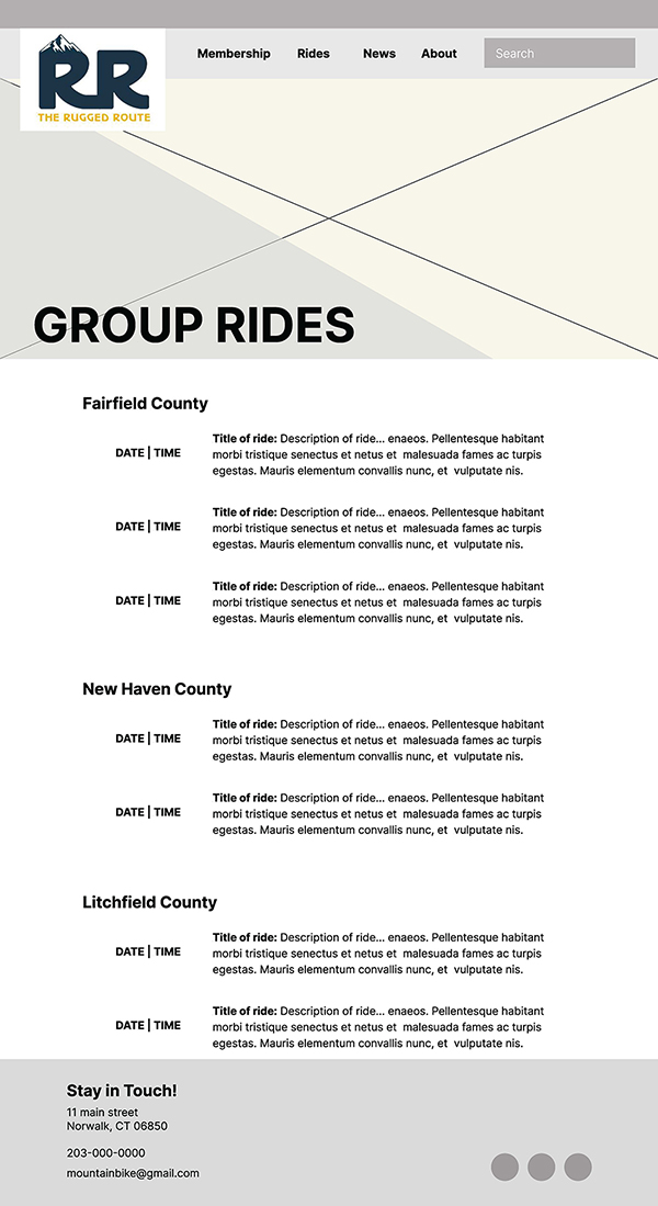 With my style decided on, I then moved on to creating a site map for the entire website. While this can normally be a large undertaking, I was exciting to get my thoughts organized. I knew the homepage would have the usual, with a header navigation and that a part of the site would be various sign up forms. As you can see below, I chose to have memberships, rides, news, and the about page in the main navigation. The rest of the website stems from these four pages. At The Rugged Route site, you can easily sign up for the club, learn about the board members, read up on news, find group rides in your area, or even look up trail maps. The group rides page is listed twice in the site map because I felt this was an important page that would be searched for often. Having multiple paths to this page will allow it to be found more easily. I imagine most visitors coming to the site will be members and this will be a page that they often come back to. I have also designed the site to where most pages lead the user to another page, encouraging browsing, and keeping them on the site longer.
