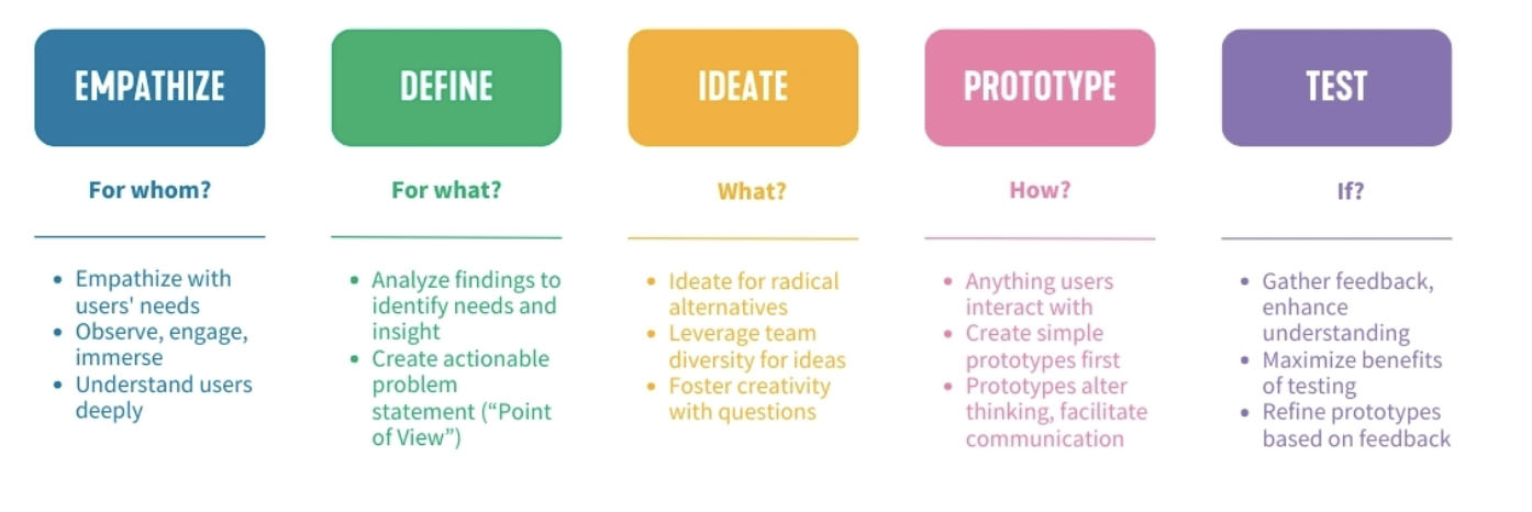 The five phases of this process are: Empathize, Define, Ideate, Prototype, and Test. This gives us a non-linear path that can be and often is repeated, until there is a desired result. Using this line of thinking also means you are aiming to understand user needs and once you know them, you can come up with better solutions.