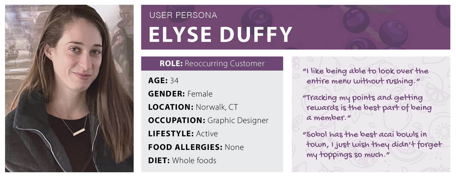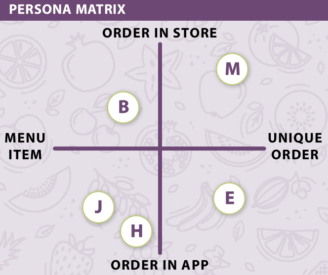 For my Sobol persona I was also able to make a second user that would represent the typical new user for the app. I named her Janet and she was a new customer that was health conscious but also had a lot of food allergies, so she was hesitant about ordering through the app. However, because of her diet, she also liked the customization options when ordering and loved getting to see the full menu in the app. She was actually much closer to me on the matrix than I thought, but also brought enough differences that she represented a whole new customer base.
