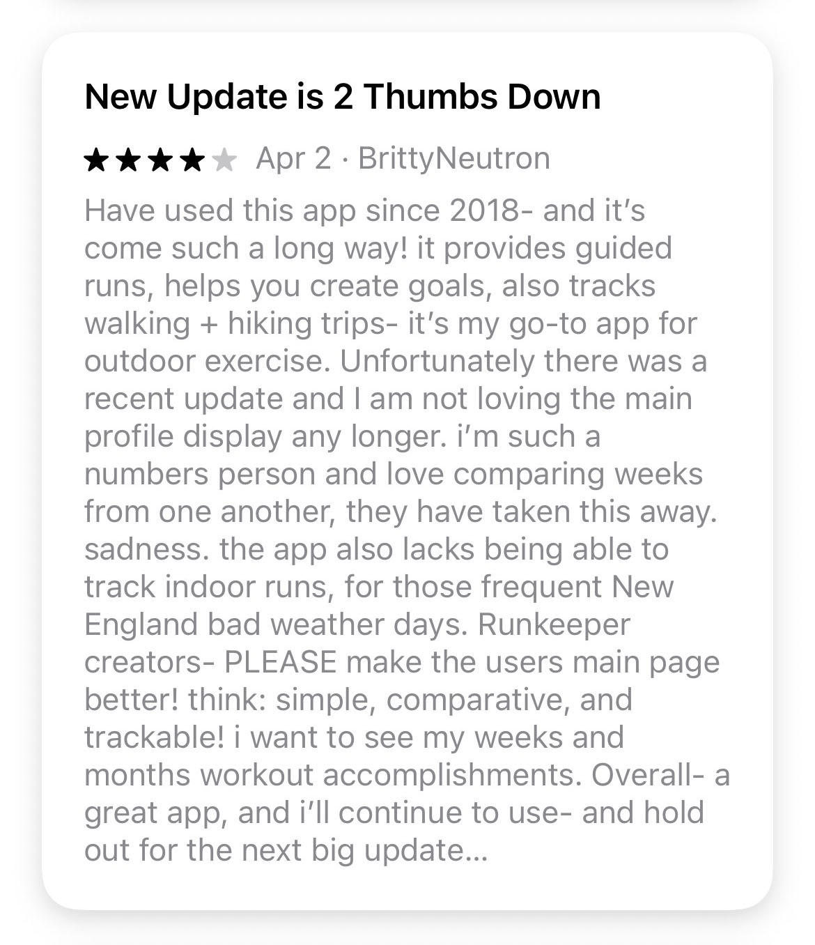 Lastly, I looked for suggestive reviews where users talked about suggestions and what they wished the app could do. These types of reviews are most helpful when writing POVs because they show you how your app could improve, even if its highly rated. Reading these types of reviews, where they suggest changes, bring both perspectives to the table. When reading about RunKeeper, a longtime user complained that updates were changing the app interface too much, making it hard to read and compare workouts.
