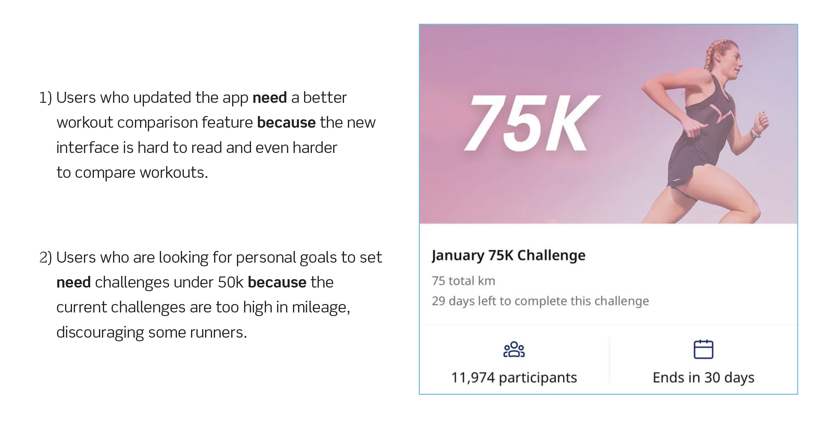 When it was finally time to write my POV statements, I gathered all my reviews and started to identify specific user types. Some may be distance runners while others may be more interested in tracking their food intake. I then focused on specific user needs that were mentioned. While the needs are important to identify, it’s even more important to think about the insights generated from these needs. Once these three parts were defined, I started writing my POV statements using this general structure: