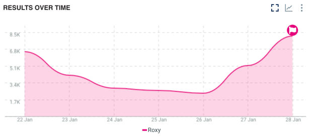 Roxy’s mentions on social media were highest on Wednesday (1/21). This makes a lot of sense after looking at their Instagram page. But not because of the X Games. If you visit, you’ll see that they posted twice in one day, and I remember seeing plenty of Instagram stories as well. This was because Roxy was debuting their latest snow collection. Their posts consisted of carousels and videos showcasing the pieces, and I also noticed that these posts had a high number of interactions, including shares. Since Wednesday is considered one of the best days to post online, I’m sure this content reached a good amount of people and helped boost Roxy’s overall views on this day. However, looking at the graph above, you’ll see they couldn’t maintain engagement levels for more than a day or two. Yet the graph eventually does trend upward again.