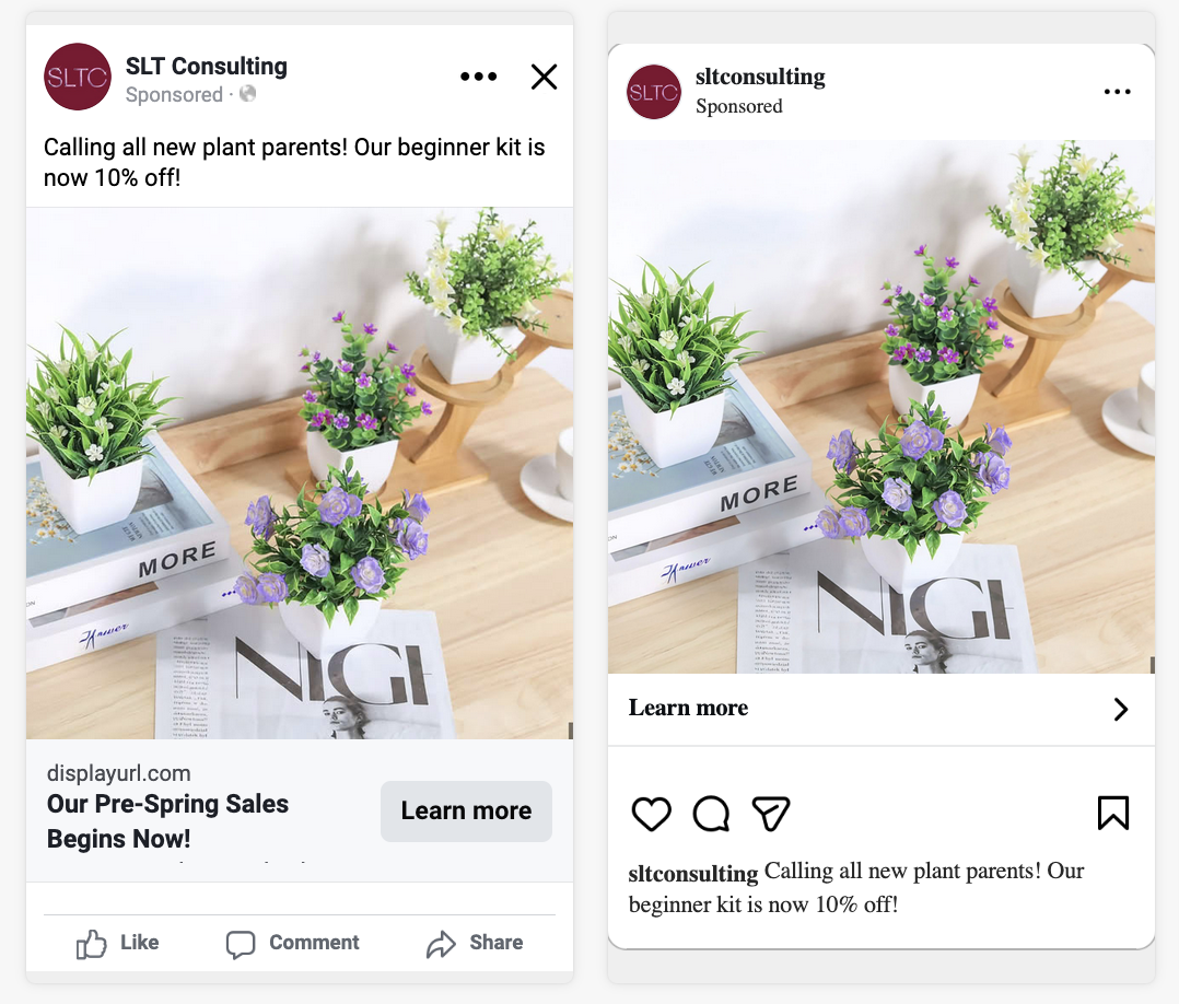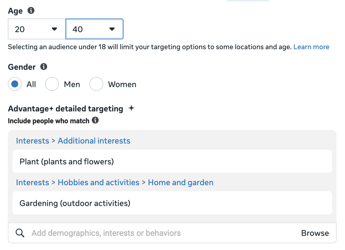I also wanted to focus on targeting specific audiences. This is important to remember because you want to create relevant content and show it to people who are interested. Knowing the typical person that enjoys, interacts, and buys your products gives you insight into who you should be targeting. Targeting should also lead to higher engagement in ads and encourage brand loyalty because users won’t feel bombarded with the content. For my plant ad, I narrowed down the age range from 20 – 40-year-olds and chose both genders since growing plants are common among Millennials and Gen-Z. From there I chose specific interest-based targeting to narrow it down even more. As you can see in the screenshot below, I chose plants and gardening as two interest topics that will help Facebook match my ad with people who like these hobbies. Of course, you can add more or less topics to make your ad as broad or as narrow as you need.