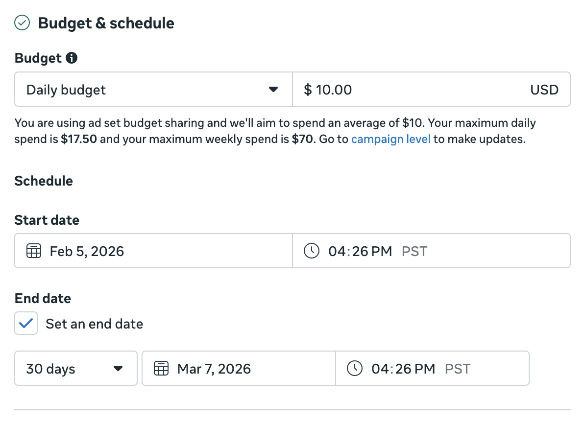 Up next I decided on a budget and schedule for the ad. I first imagined the price of a typical grow kit for a plant, which would be around $30. So, in order to help make the campaign successful, I kept the daily spend at $10. This way we minimize financial risk, while still gathering data and consistently advertising. I then set the ad to run for 30 days, which should give it enough time to show any patterns in data and sales. Running an ad for too short of a time could disrupt data trends, making you guess about your audience’s behavior. So, to be safe, thirty days is the typical benchmark.