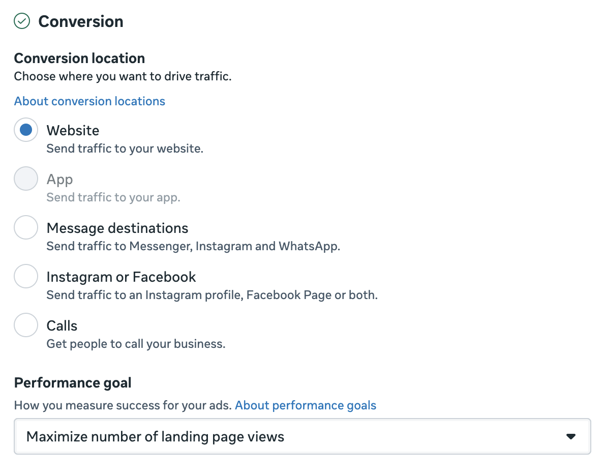 I decided to create an ad campaign for a gardening company that sells beginner growing kits to help newbies take care of their plants. This ad was going to be a pre-spring sale where the kit would be 10% off. Once I had my product and business in mind, I started defining my campaign objectives. I knew one goal would be to drive brand awareness through the ad, but I also wanted to focus on conversions. In this case, I chose conversions like measuring how many people come to the landing page and how many final sales I get. Because I envisioned making a special landing page for this sale, this type of click and revenue would be easy to track. To do this, I can chose to send traffic to my website under the conversion tab.