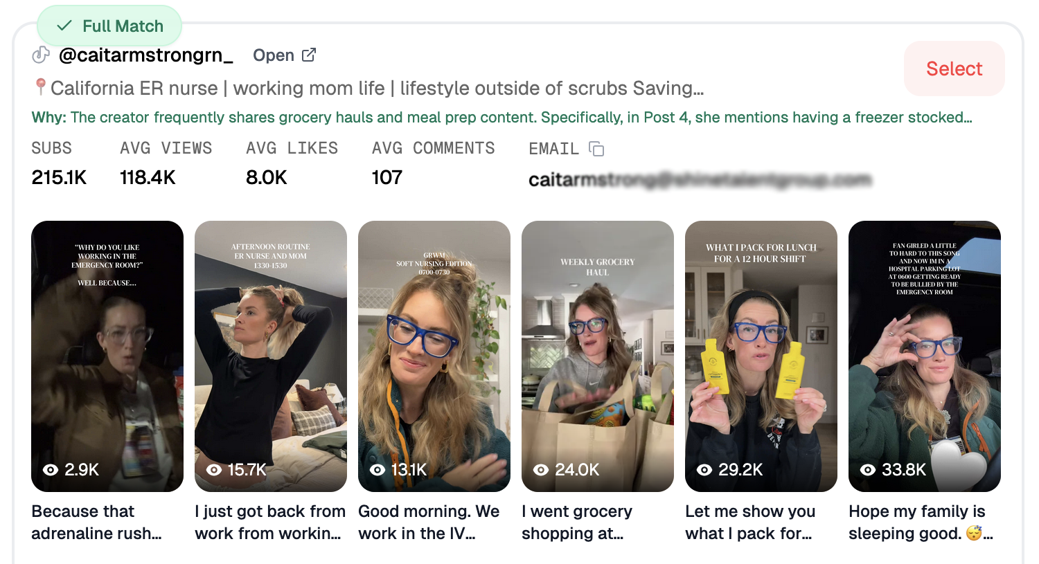 Another great influencer partnership would be with @caitarmstrongrn_. With 215k followers on TikTok, she is also considered a micro-influencer and gets high engagement and comments on almost all her posts. I chose her because she has content that is related to groceries hauls, meal preps, and meals to packs for her 12-hour nursing shift. Some of her most popular content is focused on her lunch meal preps, where she already has some health food partnerships. Ka’Chava would fit in nicely with this type of meal-prep content.