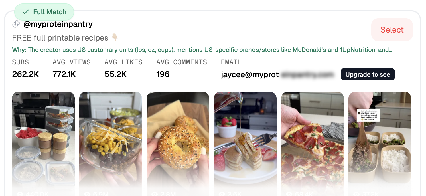 Since @myproteinpantry has great engagement and views on TikTok and Instagram, it makes sense for her to advertise on both platforms. But I noticed @caitarmstrongrn_ has more of a following on TikTok, than Instagram. So, while it’s smart to use multiple platforms for a social campaign, it should be noted that we don’t expect too much revenue coming from Caitlyn’s Instagram. What makes her a good choice still is that she promotes other health food products, both paid and organically.